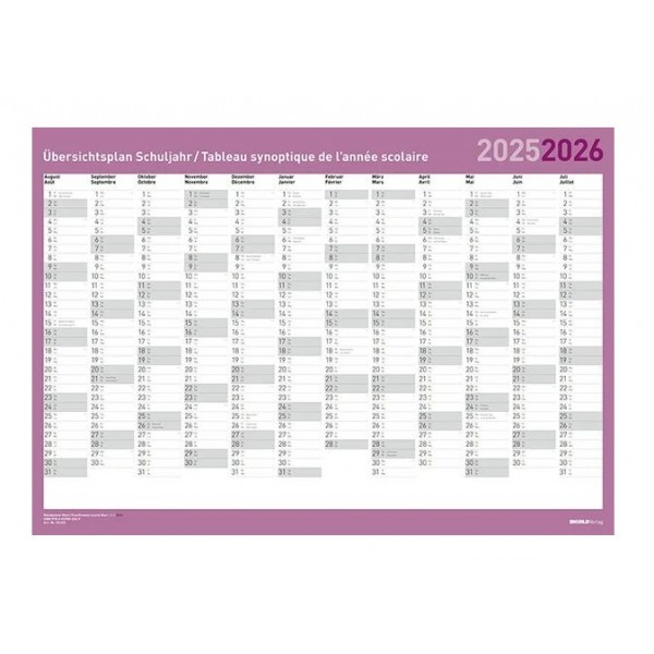 Format: Höhe 90 x Breite 60 cm, Tagesfeldgrösse: H 21 x B 43 mm. Kennzeichnug der Wochenenden in unterschiedlicher Färbung, Karton 400 gm2.